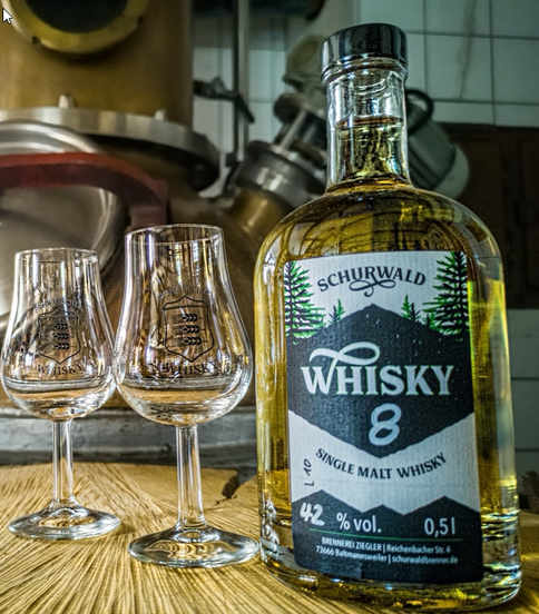 Einzigartig im Geschmack reicht dieser über Jahre im Eichenfass gereifte Whisky weit in die Liga seiner großen Irischen und Schottischen Vorbilder. Als Singlemalt spielt er die gesamte Klaviatur vom Beginn intensiven bis sanft ausklingenden Gustos. Genießen Sie Schurwald Whisky pur zu ruhigen, genussvollen Momenten. Seit dem Jahr 1997 wird in der Korn- und Obstbrennerei Ziegler in Baltmannsweiler Schwäbischer Whisky hergestellt. Die Verarbeitung von Weizen zu hochwertigen Kornbränden hat in dieser Brennerei seit 1973 eine lange Tradition. Sie ist im Grunde nichts anderes als eine Erzeugung von sogenanntem GRAIN WHISKY. Viele amerikanische Massenanbieter erzeugen mit dieser Methode. Der Besuch einer kleinen Destille in den Drakensbergen in Südafrika, und die Verkostung der dort gebrannten, hervorragenden MALT WHISKYS, war der Beweis, dass die Herstellung von gutem Whisky nicht eine Frage des Standortes, sondern eher des Know-How`s, und vor allem die Verwendung von erlesenen Rohstoffen ist. Die dort verwendeten Eichenfässer zur Lagerung des Whiskys stammen übrigens aus Deutschland. ( Quelle : Martin & Hans Jörg Ziegler) |
